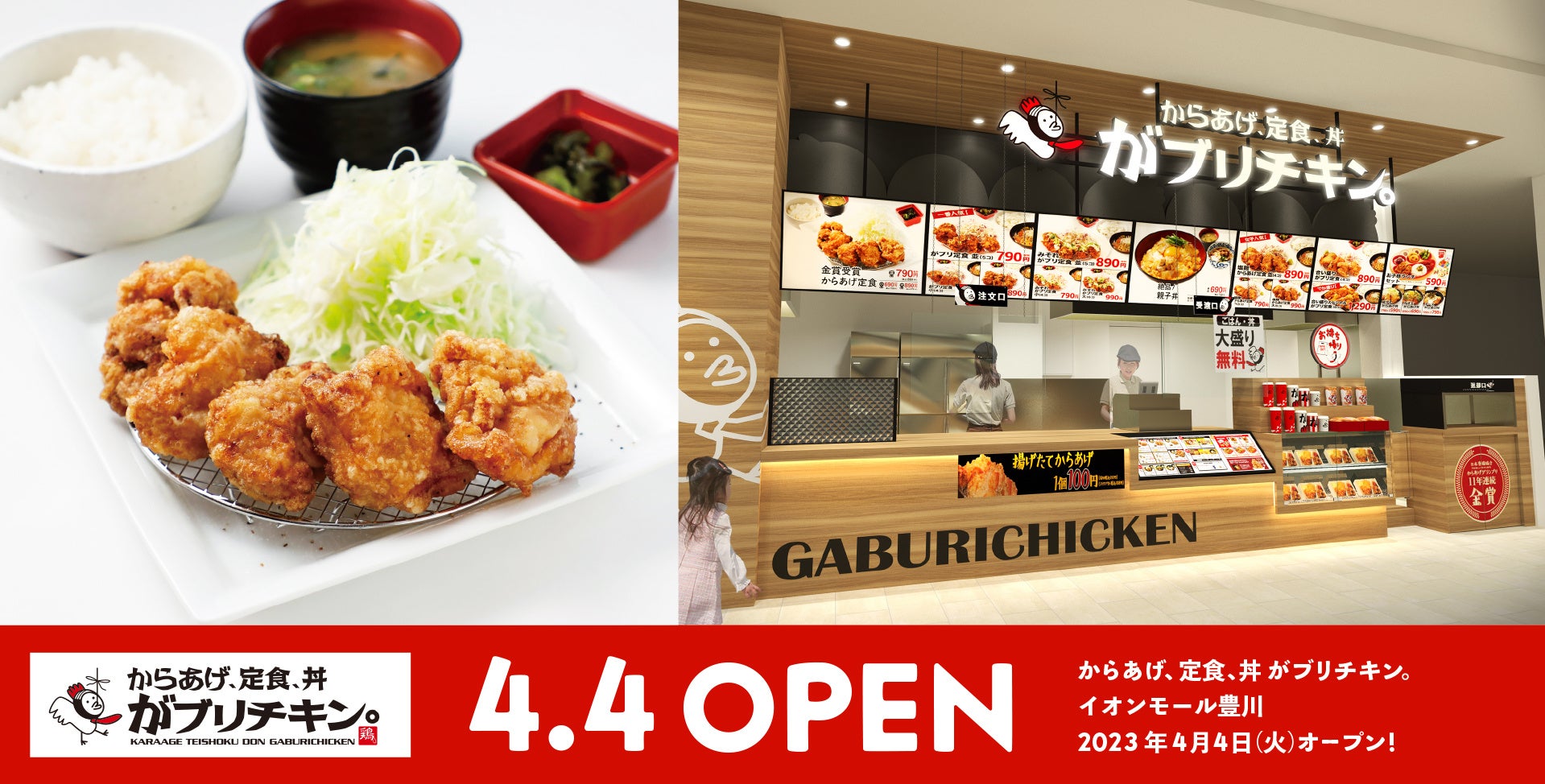 「がブリチキン。」は、新業態である「からあげ、定食、丼 がブリチキン。」豊川市初出店となる「イオンモール豊川店」を、2023年4月4日(火)にグランドオープンします!