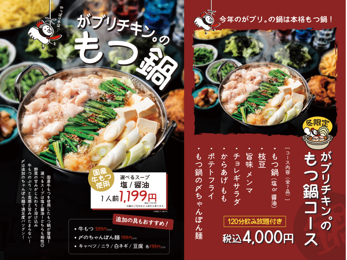 この冬、あったかもつ鍋を囲んで、がブリチキン。で一杯いかがでしょうか?